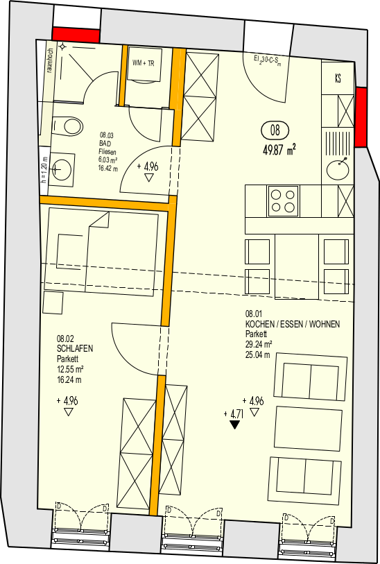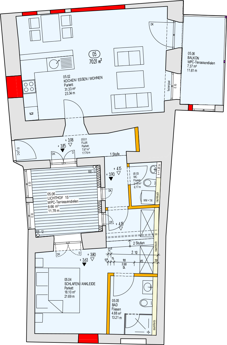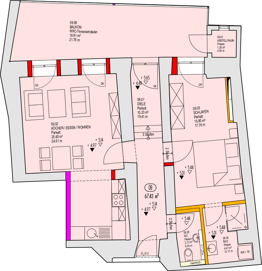 Für Top 4, 5, 7, 8, 9 und 10 steht jeweils ein Abstellraum außerhalb der Wohnung im selben Geschoss zur Verfügung. Die Position und Größe dieser ist dem